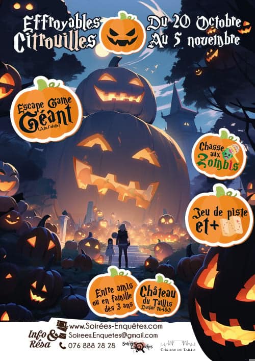 Pendant halloween, le château du Taillis devient la résidence du Croquemitaine qui prépare une armée de cauchemars !!! Effroyables citrouilles, Zombis et fantômes ne sont qu’un avant goût du pire… aidez-nous  !  Jeu de piste, jeux en bois, escape game géant ado/adulte + Escape game géant familiale  etc. De nombreuses activités vous attendent lors de ces Effroyables Citrouilles !